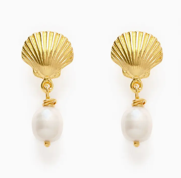 Previous NextThis summer we are celebrating the glorious California coast. We're calling it the Pacifica Collection. Shells are trendy! Pearls are trendy! Made of 14k gold plated brass, lead and nickel free with genuine freshwater pearls. They measure 1" in length. Designed and assembled in our Sonoma California studio.