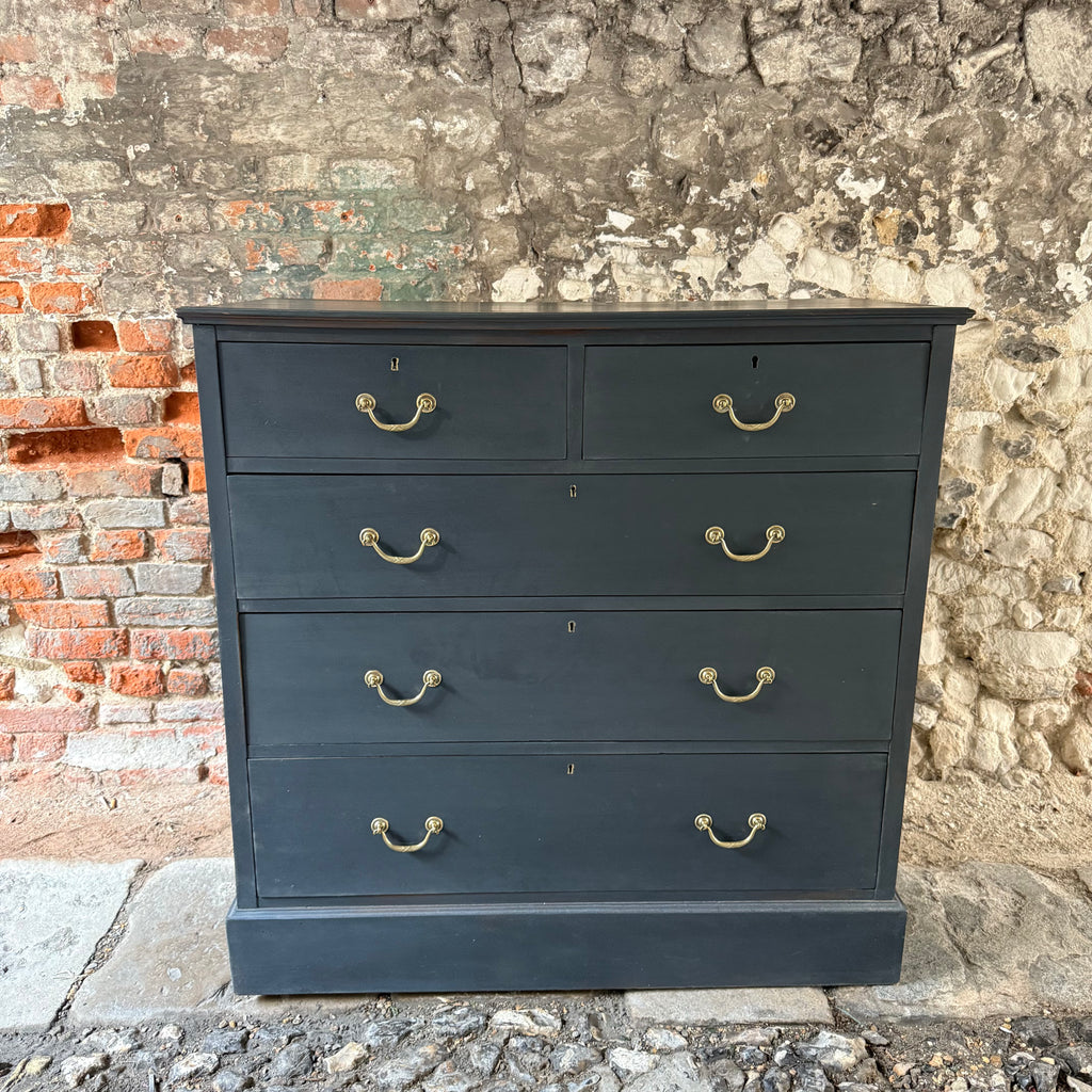 An antique pine chest of drawers spray painted in an inky blue/black colour.