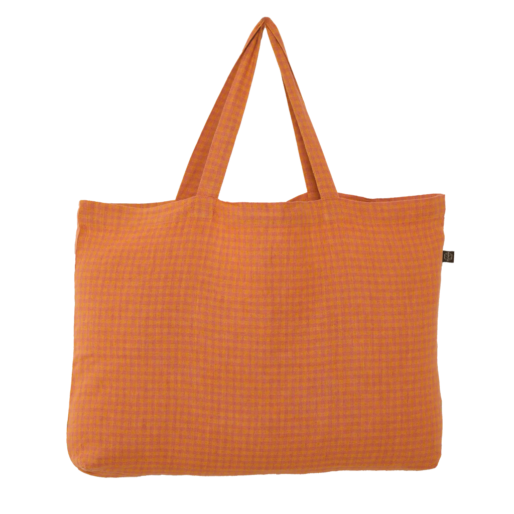 A versatile linen and cotton cabas bag in a rich burnt orange hue, perfect for everyday essentials or market trips. Measuring 60cm x 35cm, this generously proportioned bag offers ample space while maintaining a refined, minimalist aesthetic.