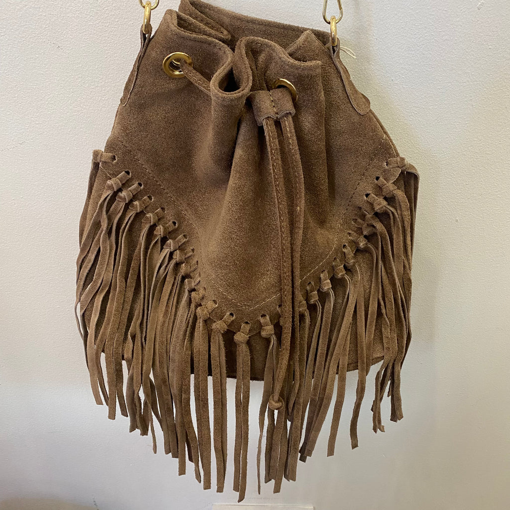 Suede Leather Fringed Bucket Bag - Taupe