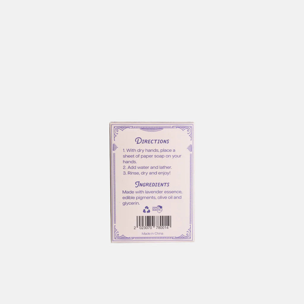 Previous NextPerfect for popping into your toiletry or gym bag, these fragrant paper soaps from 123 Farm are ideal for on the go freshness. These paper soap sheets dissolve in water and will leave your hands clean, soft and lightly scented. Comes in three scents: this one smells of lavender.