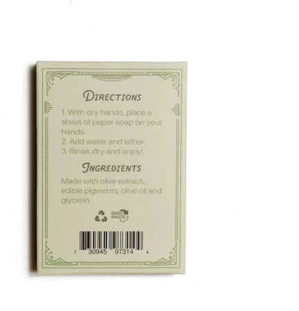 Previous NextPerfect for popping into your toiletry or gym bag, these fragrant paper soaps from 123 Farm are ideal for on the go freshness. These paper soap sheets dissolve in water and will leave your hands clean, soft and lightly scented. Comes in three scents: this one smells of olive