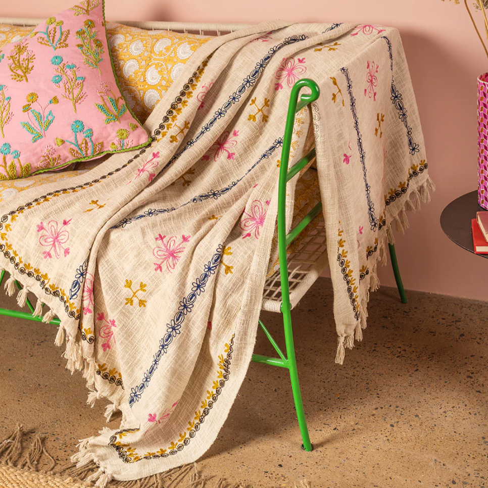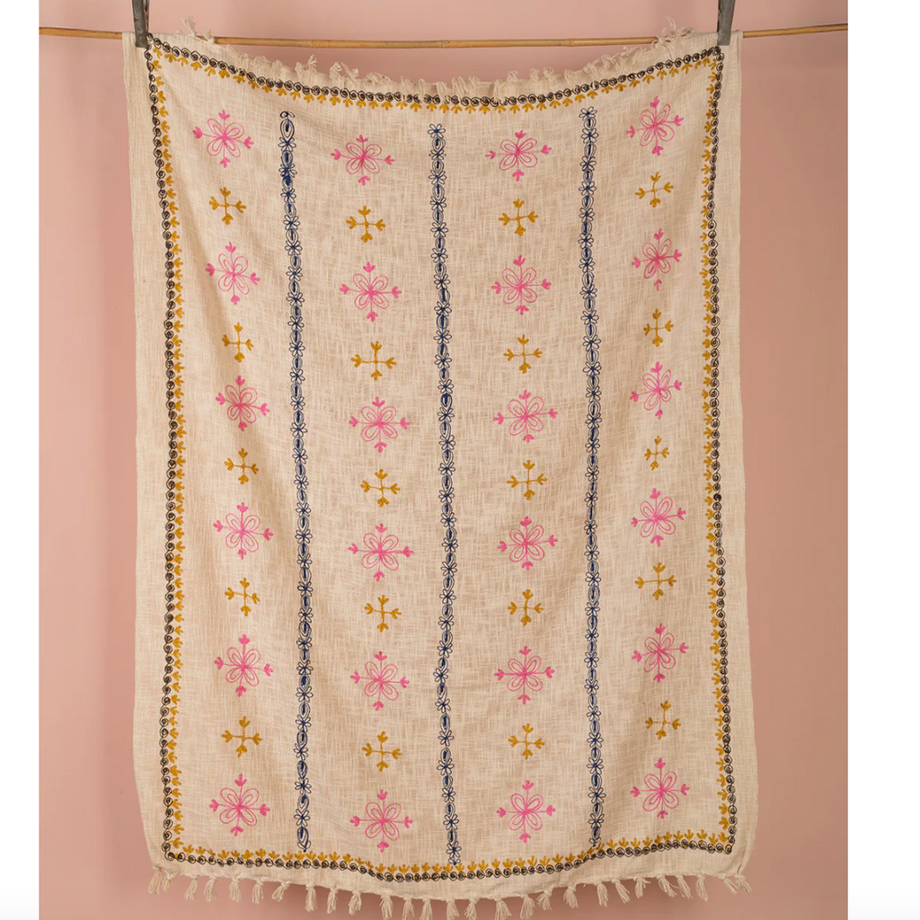 Previous NextThe Rosaline pink flower handloom suzani throw has been made from 100% cotton for a soft and luxurious feel. The gentle neutral colour throw has been machine embroidered with delicate floral motifs and pattern borders creating an elegant design.