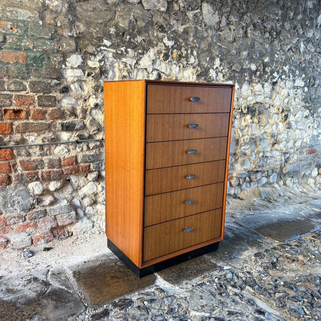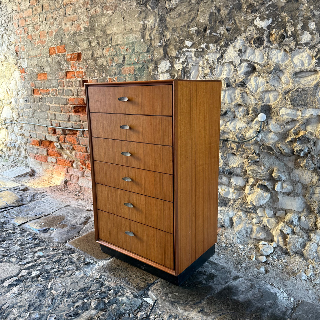 Discover authentic mid-century design with this original teak drawer unit. Featuring six spacious drawers set in a distinctive black wooden base, this tall boy combines timeless style with practical storage for modern living.