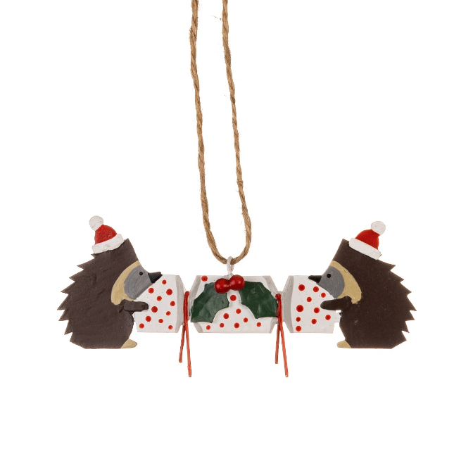 A tin decoration of hedgehogs pulling a spotty cracker.