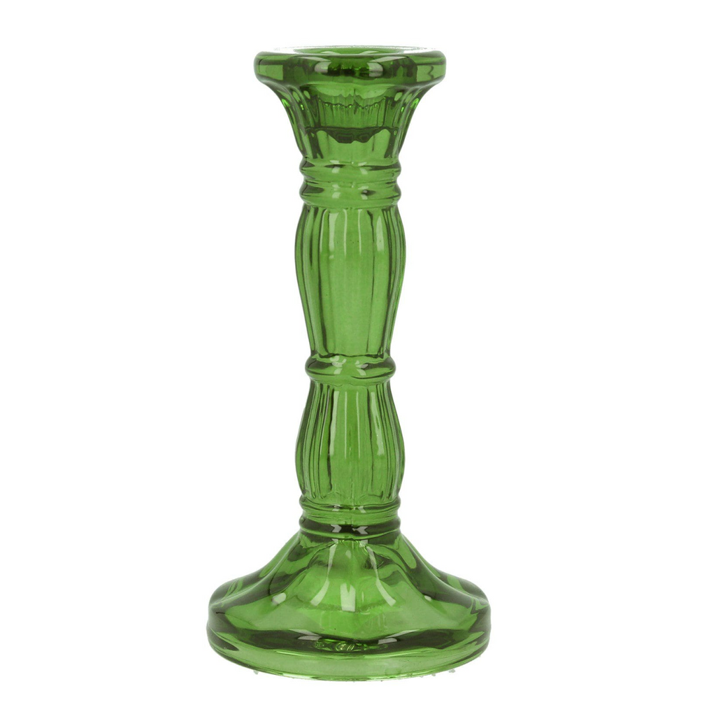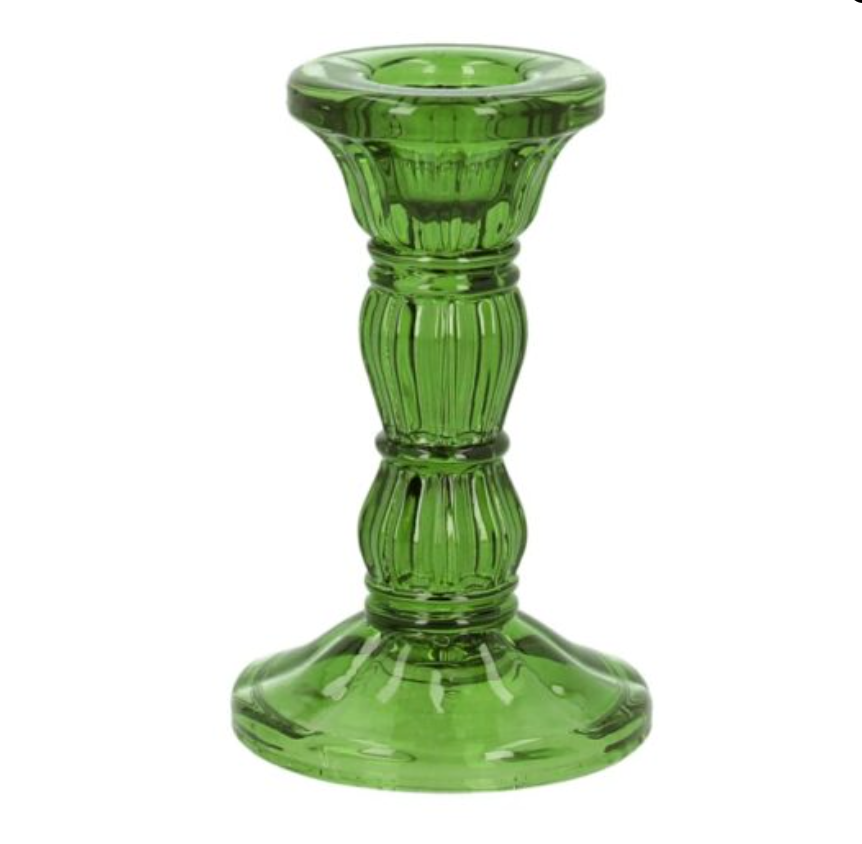 Pretty green glass moulded candlestick, perfect for your winter setting.