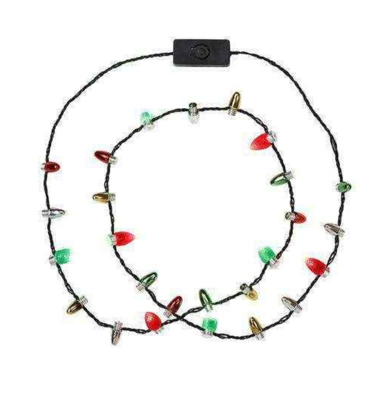 Previous NextAdd festive spirit to your outfit with this Christmas lights necklace. It has three flashing modes that'll really get your party going! Perfect for fancy dress and Christmas fun. Features a black wire with red, green, gold and silver LED bulbs. Slide switch to change between three light modes: 1) Quick Flash 2) Constant Flash 3) Glowing.