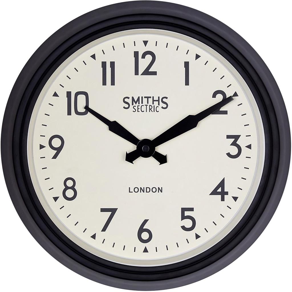 Previous NextPossibly the most popular and reproduced retro clock is the Smiths Sectric Delhi design. Originally an electric AC/DC clock with a Bakelite case. Now reproduced in a high gloss black finish with baton hands and an off white dial.