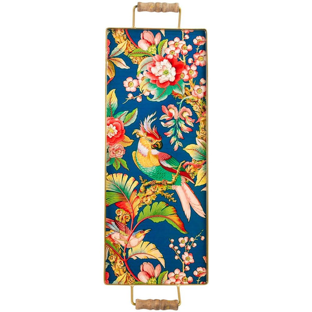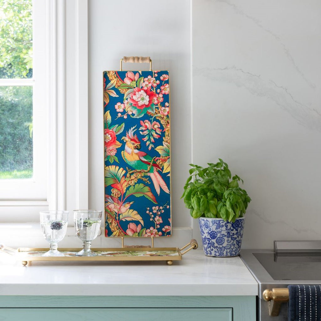 Previous NextBright, fun, practical and pretty, what more could you wish for in a tray? This lovely tray is made from metal with a bright brass edge and bold and bright Parrot in the jungle decoration over the bottom of the tray. There are solid turned wooden handles either end, fill with your favourite tipple for your friends and family and enjoy!
