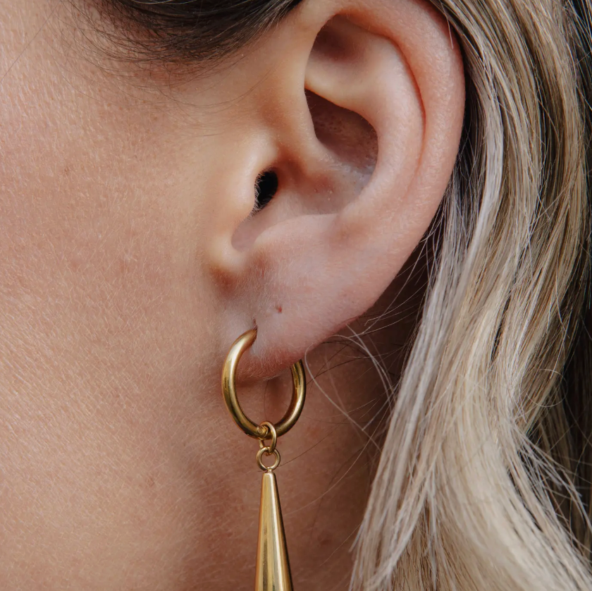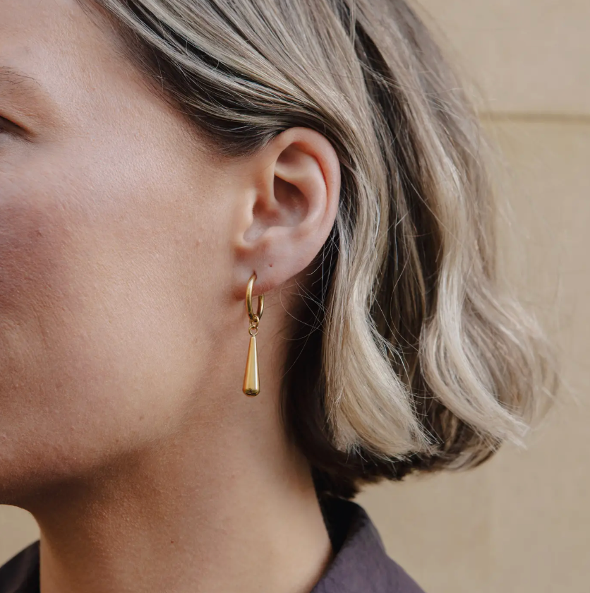 Previous NextThe gold elongated drop earrings feature a smooth, tapered teardrop suspended from a classic hoop. finished in tarnish-free gold plating, their clean lines and fluid form offer a modern take on minimal drop earrings, balanced, polished, and versatile. Crafted from a blend of stainless steel and 18k gold, this design offers both durability and a luxurious appearance. The surface is PVD-coated to ensure a lasting, brilliant shine. The high-quality materials resist tarnishing and are hypoallergenic, making them suitable for even the most sensitive skin. Additionally, its water-resistant design allows for worry-free wear in any weather conditions. – Material: Tarnish-resistant 18K gold plating on stainless steel – Water-resistant finish – Hypoallergenic – Sold as a pair – Premium eco box included – Perfect Autumn Winter Christmas Gift Idea Diameter: w 2 cm / h 1.6 cm