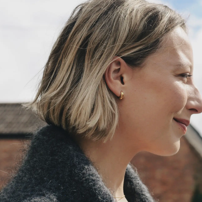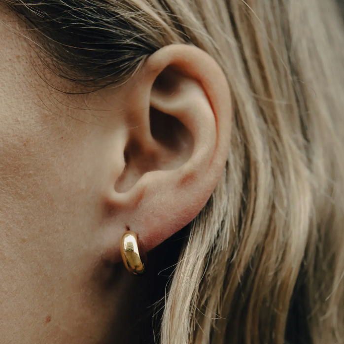 Previous NextGold Small Leverback Bold Hoop Earrings are a daily essential you'll never want to take off. These chubby huggies are ultra-comfortable, perfect for wearing day and night. Their bold shape ensures they make a statement on their own, adding a touch of flair to any look. Crafted from a blend of stainless steel and 18k gold, this design offers both durability and a luxurious appearance. The surface is PVD-coated to ensure a lasting, brilliant shine. The high-quality materials resist tarnishing and are hypoallergenic, making them suitable for even the most sensitive skin. Additionally, its water-resistant design allows for worry-free wear in any weather conditions. – Material: Tarnish-Resistant 18K gold plating on stainless steel – Water-resistant finish – Hypoallergenic – Sold as a pair – Premium eco box included Diameter: h 1 cm x w 1 cm