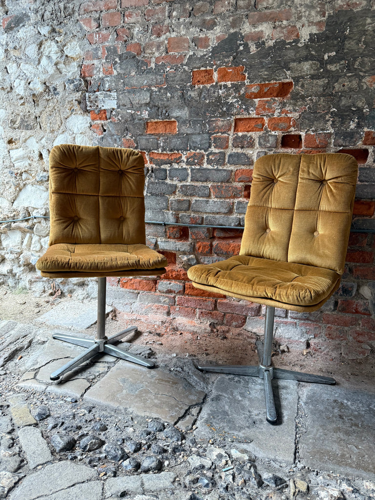 Discover these original mid-century Peak Furniture swivel chairs, upholstered in rich mustard velvet that captures the warmth and character of 1950s design. These iconic rotating seats feature the clean lines and functional elegance that define mid-century modern style.