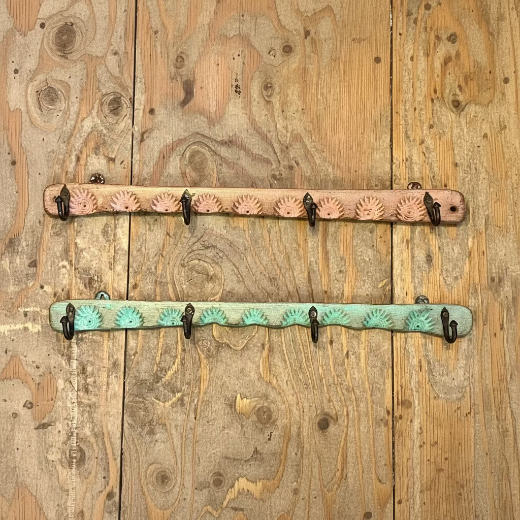 NextSet of 4 vintage metal mini hooks on old painted blackboard.