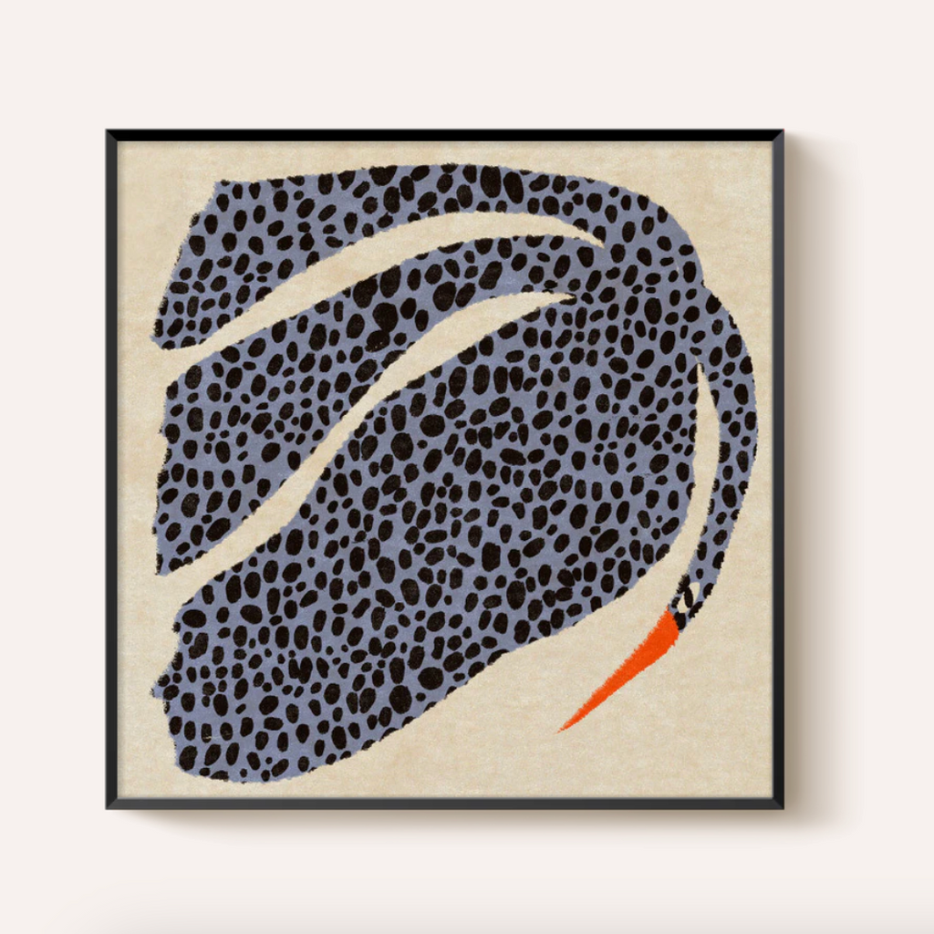 Captivating art featuring a stylized spotted bird with bold patterns and a vibrant orange beak, adding a playful touch to any space.