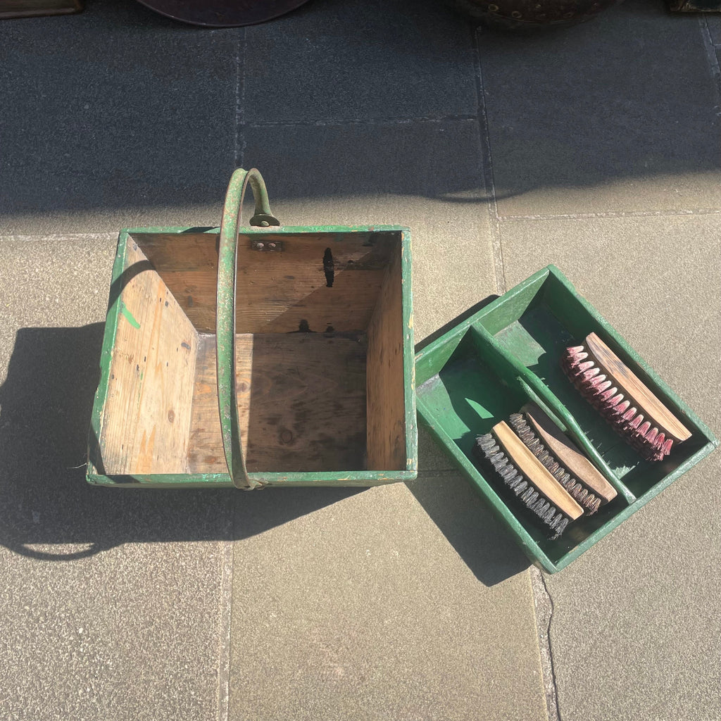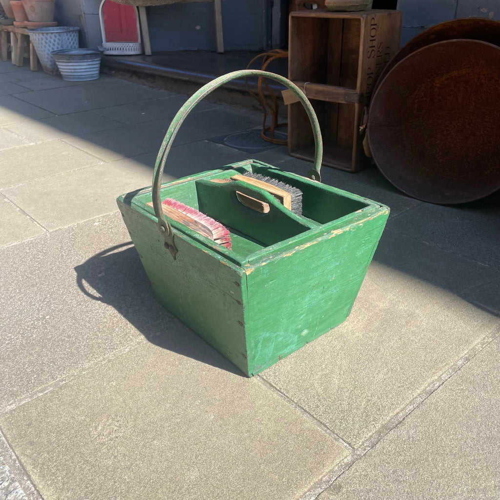 A vintage wooden, green painted shoe cleaning box with metal handle and removable tray.