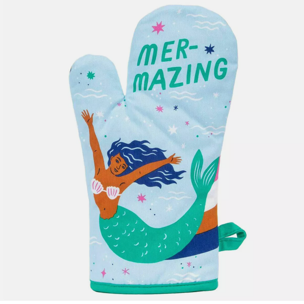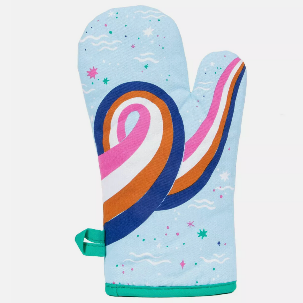 Look at this mitt, isn't it neat? Wouldn't you say my kitchen collection's complete? Super-insulated. 100% cotton.
