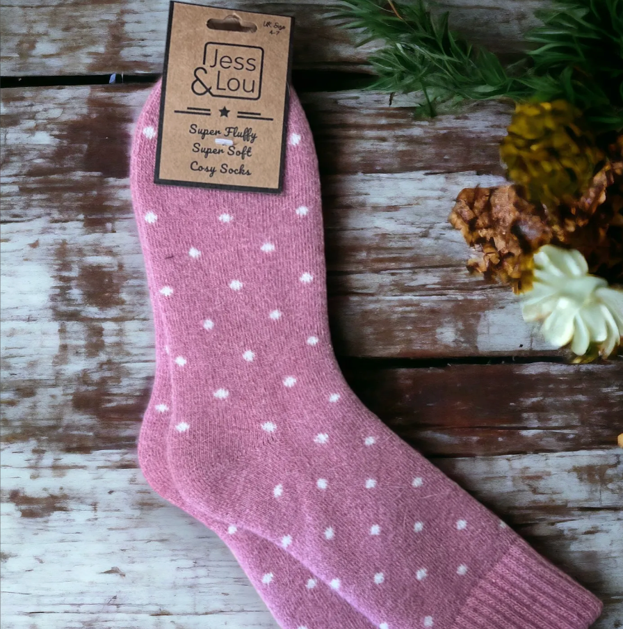 Previous NextTreat your feet to pure comfort with these delightful pink dotty ribbed socks from Jess & Lou. Featuring charming dots and a super soft, cosy ribbed design, these socks are perfect for lounging at home or as a sweet gift.