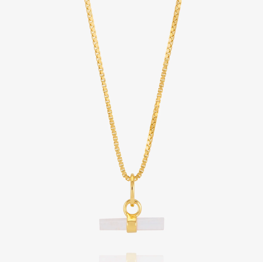 Previous NextWhere beauty meets meaning. Part of our Love Story collection, the Rachel Jackson tiny Rose Quartz T-Bar Necklace symbolises love and balance. The delicate stone sits on an adjustable length chain, crafted from 22ct gold-plated plated on certified recycled silver. Style it solo for understated charm or layering with chunkier chains to balance softness with a statement.Metal: 18 carat gold plated sterling silver