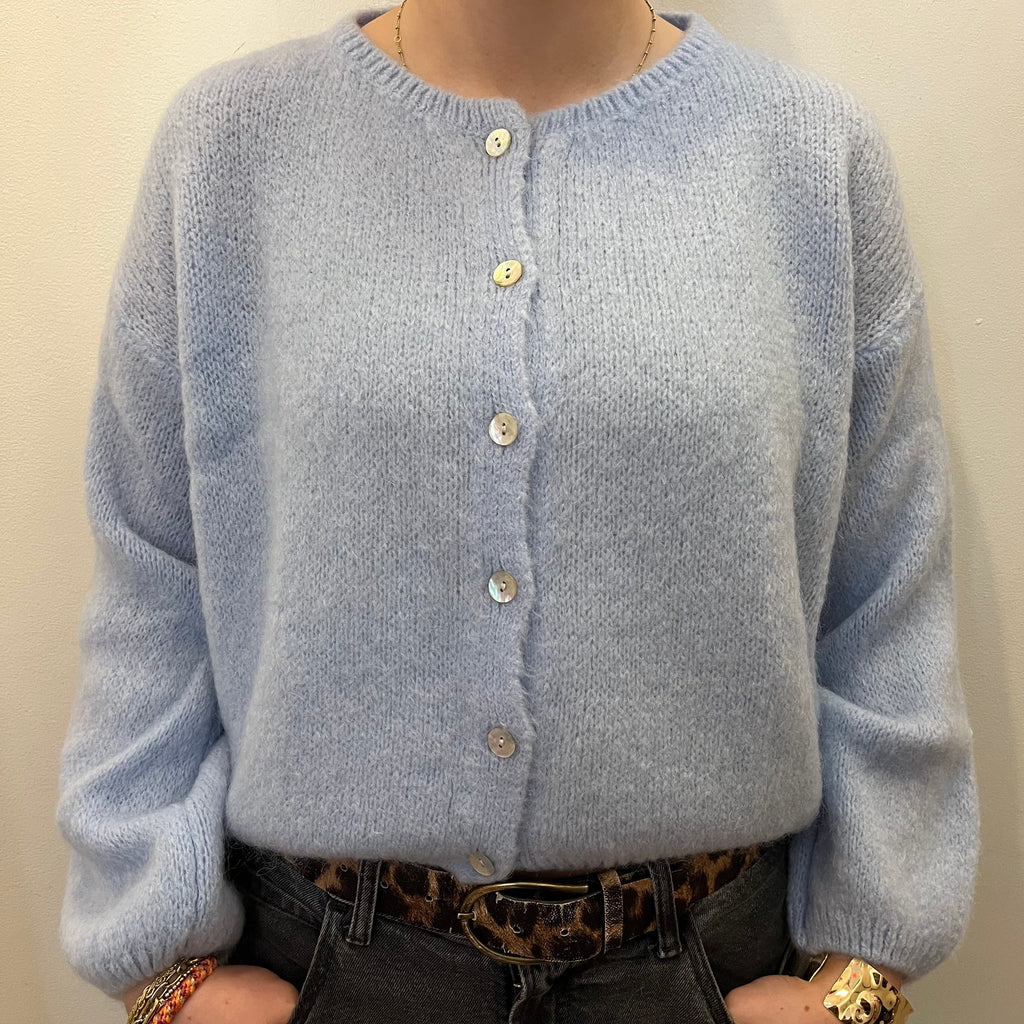 The Long Sleeve Mohair Cardigan in Pale Blue brings a touch of serene sophistication to your wardrobe. Crafted from a sumptuous mohair blend, this button-front cardigan offers cloud-soft comfort and timeless style that transitions beautifully through the seasons.