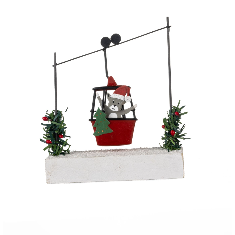 A gorgeous Christmas decoration of cats in a cable car on a block.