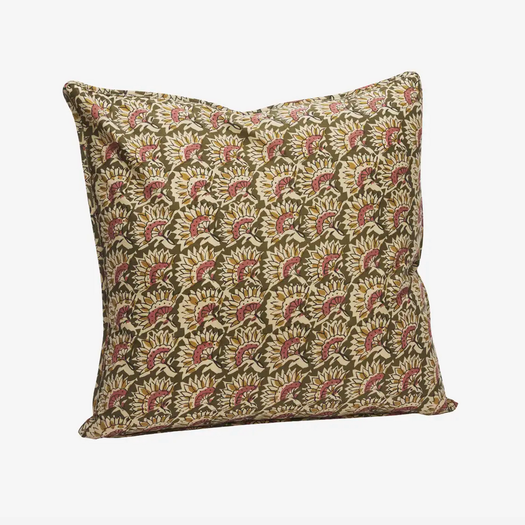 Previous NextThis printed cushion cover, crafted in India, features vibrant olive, sand, old rose, and mustard hues. Made from durable cotton with a concealed zipper, it draws inspiration from traditional Indian block prints. Mix with various prints or textures for a personalized look.
