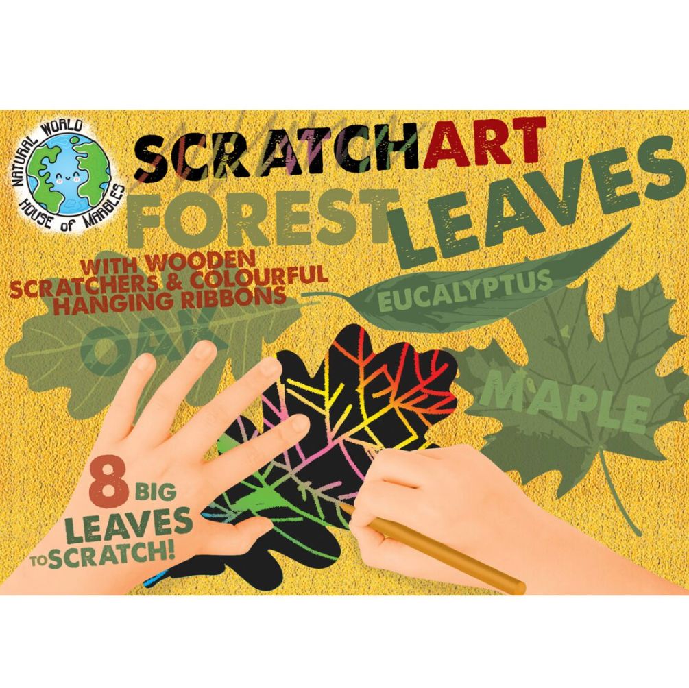 Scratch away the black to reveal a rainbow. Let your creative spirit shine through. This set contains eight large leaf shapes, two wooden scrapers, and eight good lengths of colourful ribbon to hang your creations.