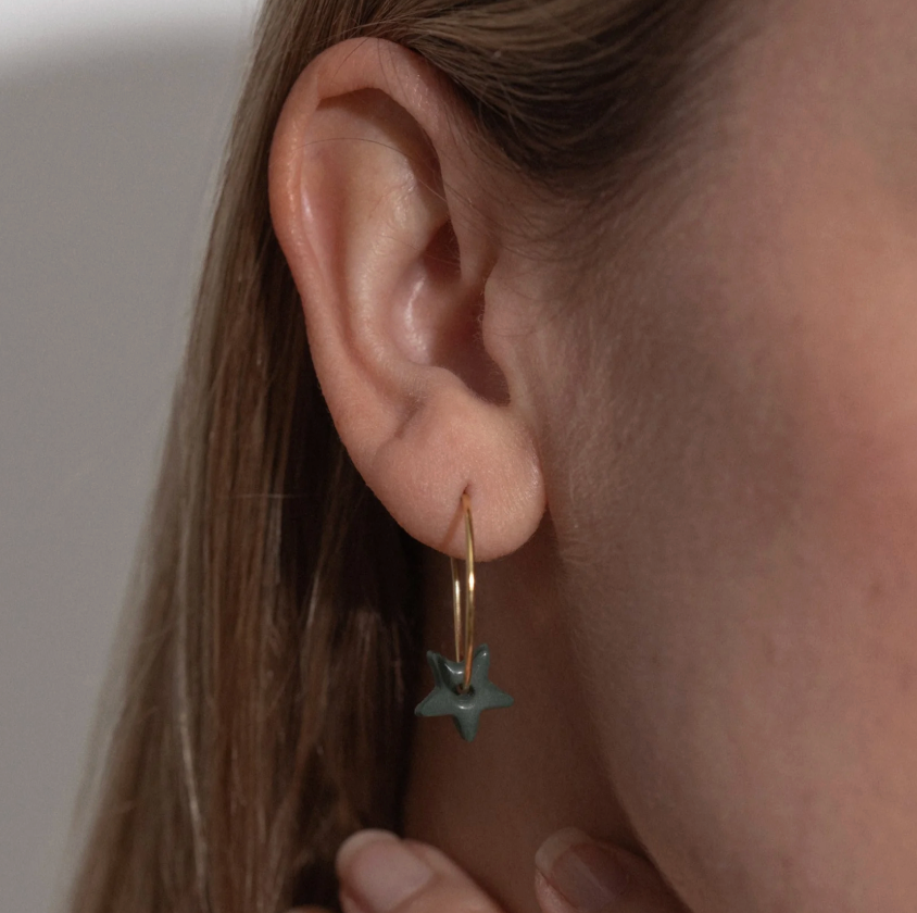 Our handmade Sage Porcelain Star Earrings are finished with a gorgeous gold celestial star design in our Devon studio. They add a little glamour to any outfit and come in our beautiful glass bottle making them a perfect gift.
