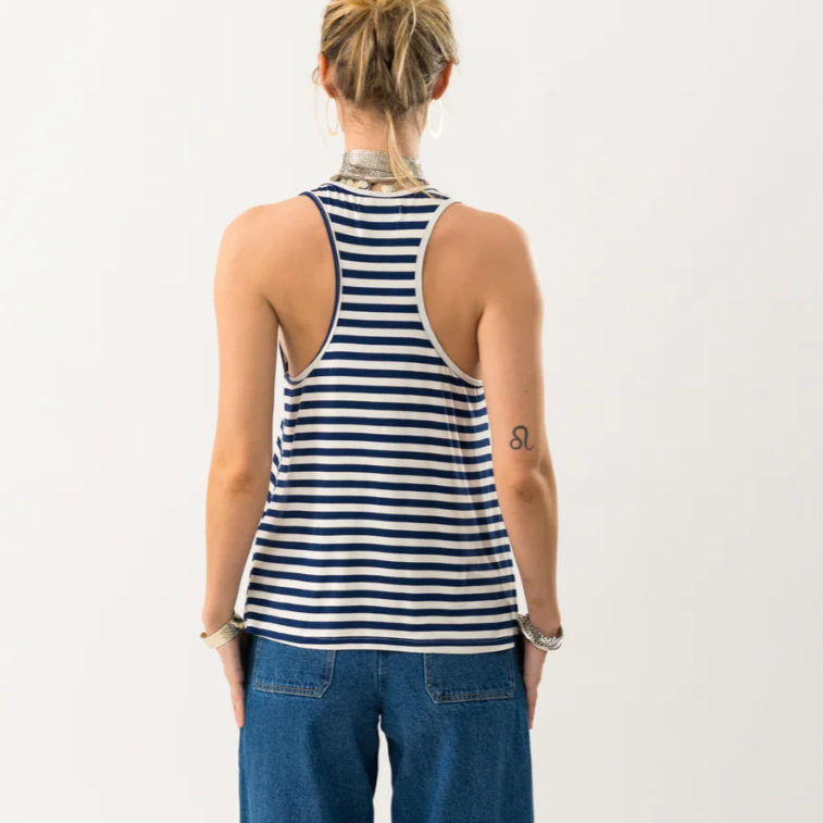 Previous NextThe Als top by Lollys Laundry is comfortable and perfect for warm days and laid-back looks. It’s made from an ultra-soft fabric and comes in both classic blue and fresh red with white stripes.