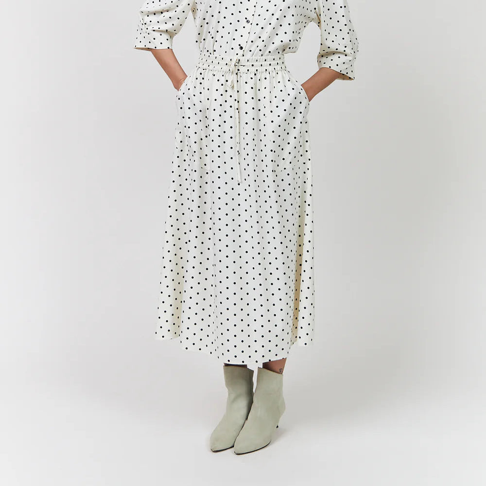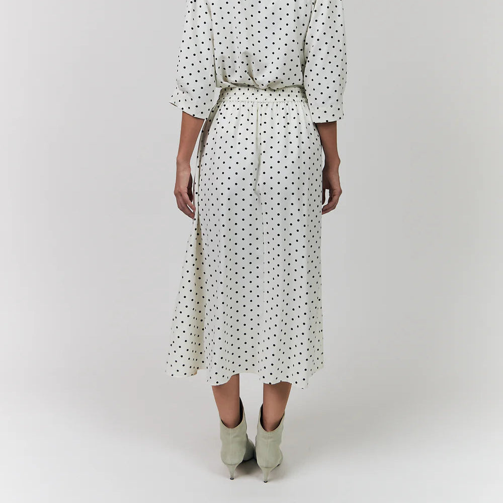 Previous NextAkaneLL is a feminine midi skirt crafted in a beautiful quality fabric that drapes elegantly. Featuring a classic polkadot print, it combines timeless style with everyday comfort. The elastic waistband with tie string ensures a flexible, flattering fit, while the light silhouette strikes the perfect balance between relaxed and refined. Midi length and understated design make it versatile for layering or wearing solo. Pair with the BonoLL shirt for a coordinated, editorial-ready look.