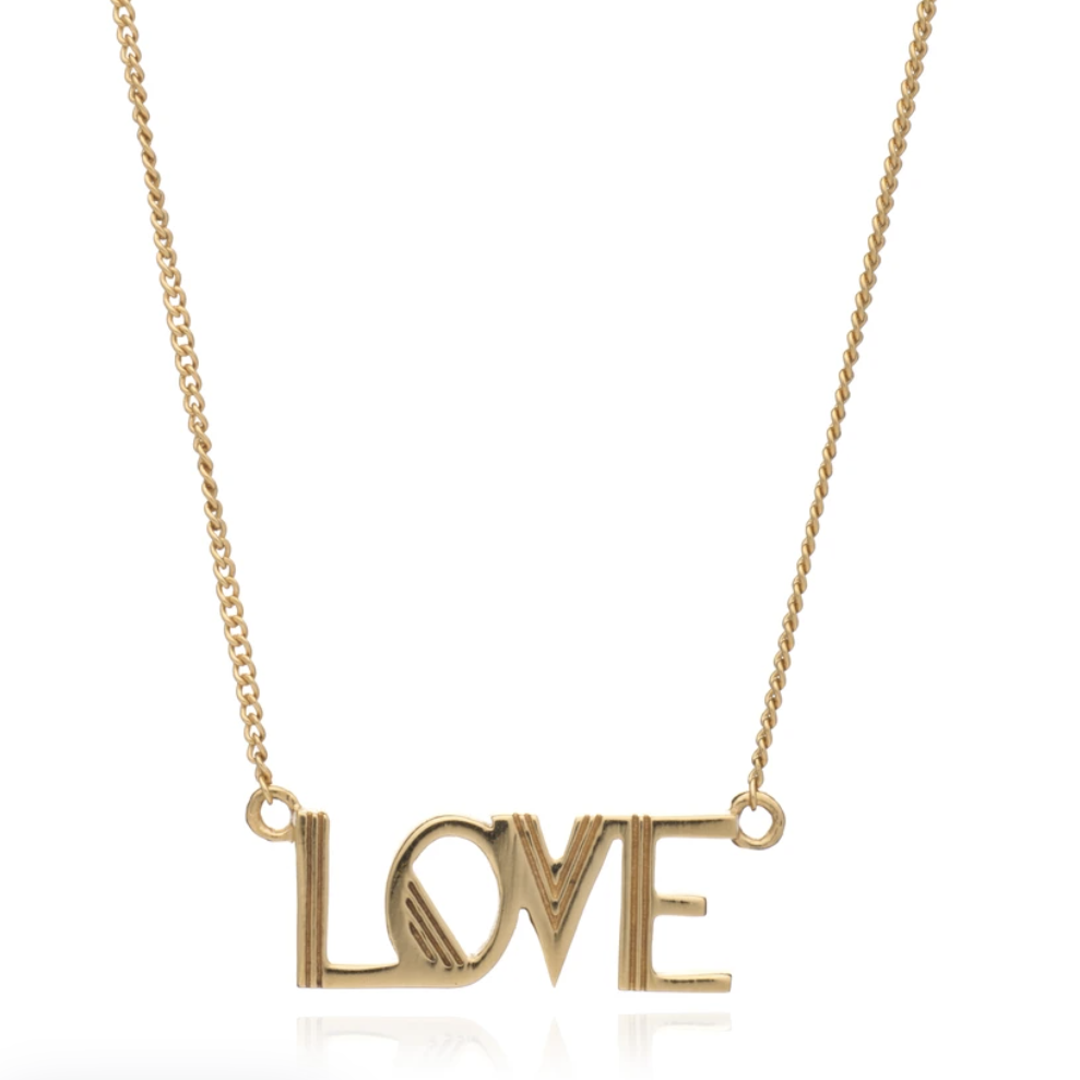 This unique, 22 carat gold plated sterling silver LOVE word necklace features art deco inspired letters.