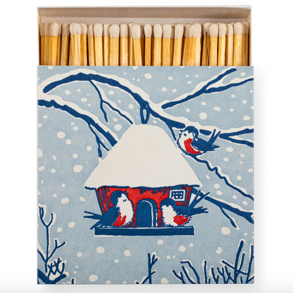 A winter wonderland in a matchbox. This vintage inspired design features a snow-covered birdhouse and tree with three winter birds perching. The Winter Birds Matches are perfect for the full festive season, offering a snowy design for all of your loved ones.