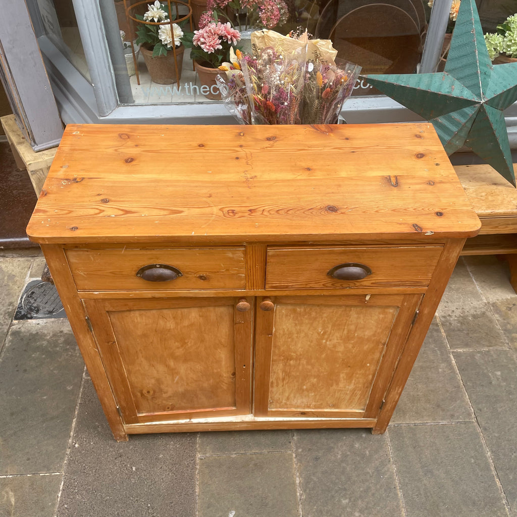 A vintage pine kitchen cupboard with ply sides and door fronts.