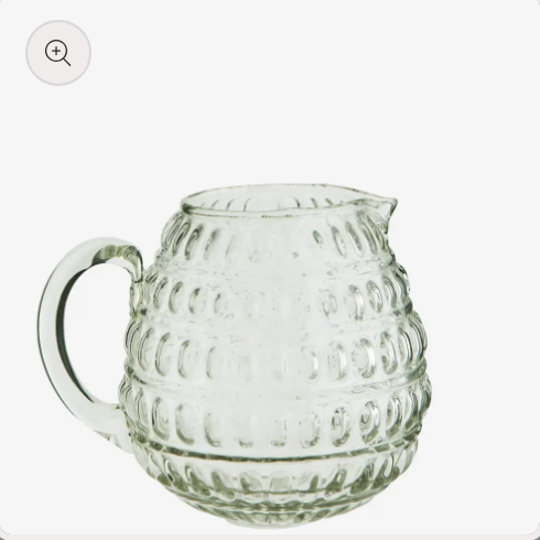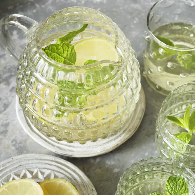 Adorn your table with this clear, sculptural glass jug decorated with dots and lines.