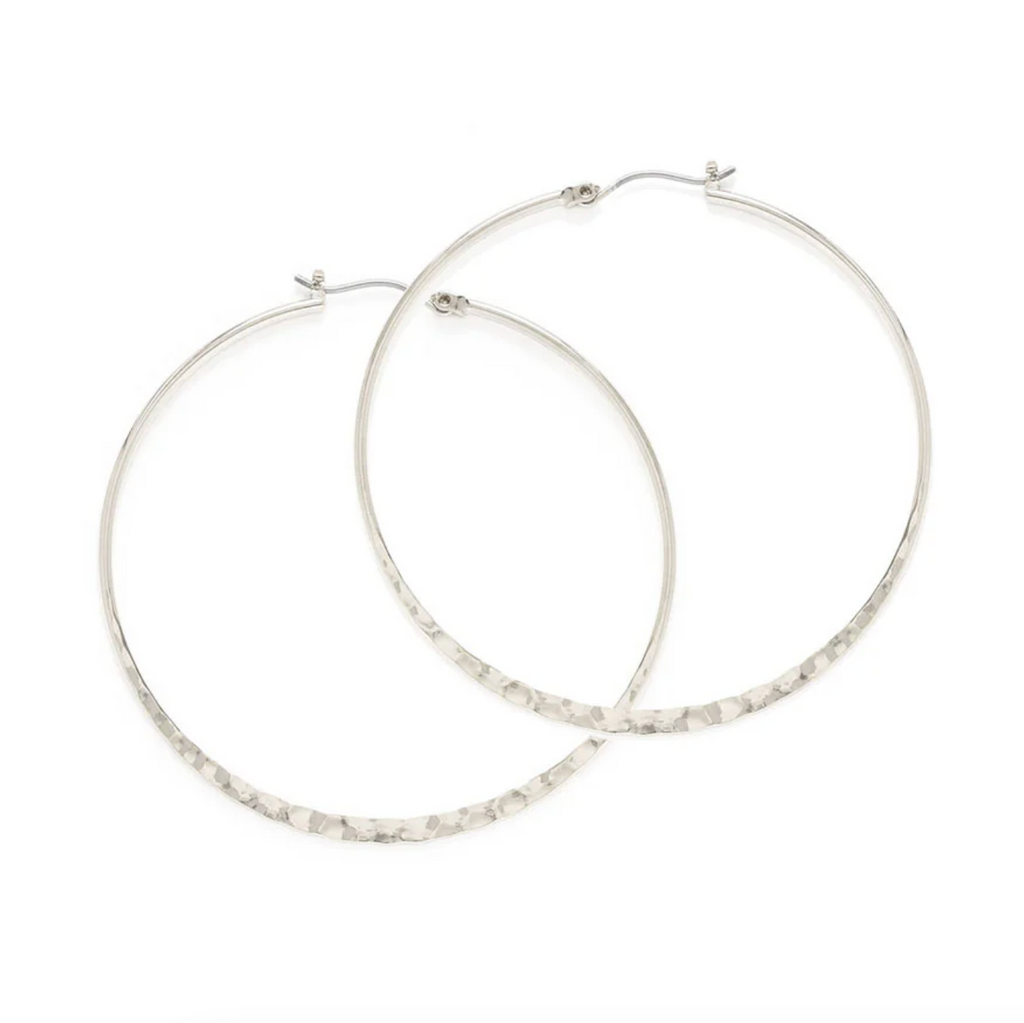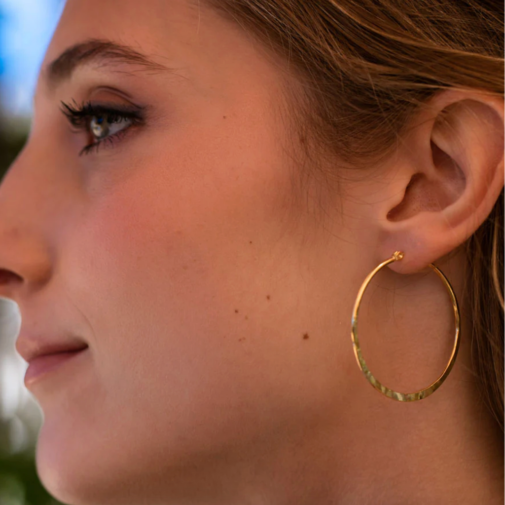 These 1.5" hoop earrings with a hammered pattern are a high quality staple you can wear everyday. Made with surgical steel ear wires. Made of 14k gold plated brass, and sterling silver plated brass that is coated to prevent tarnish.