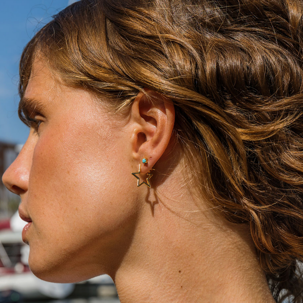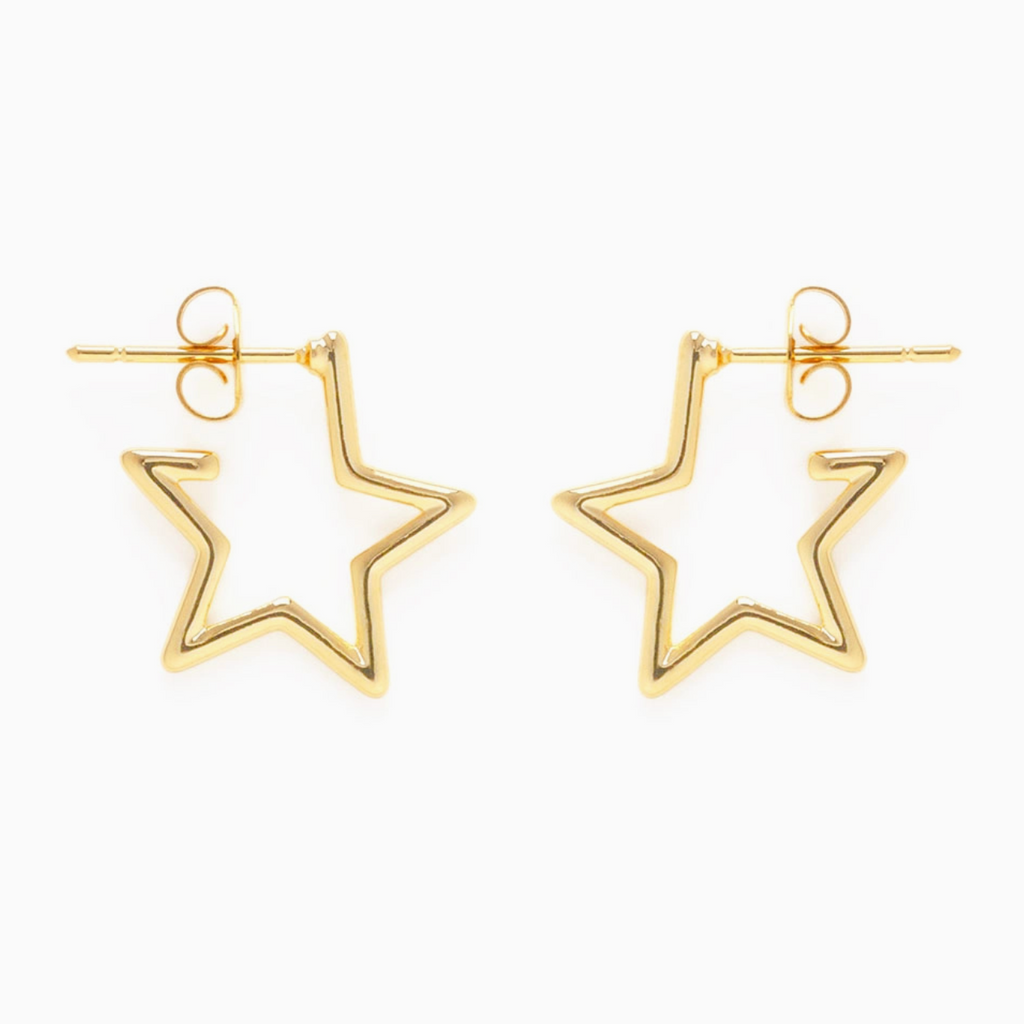 Get a super star attitude with these cute punky star hoop earrings. They are so fun in an earring stack but have enough personality to wear all on their own and not be boring! These are fun for summer and the holidays. Surgical steel posts. Made of brass with a 14k gold plate.