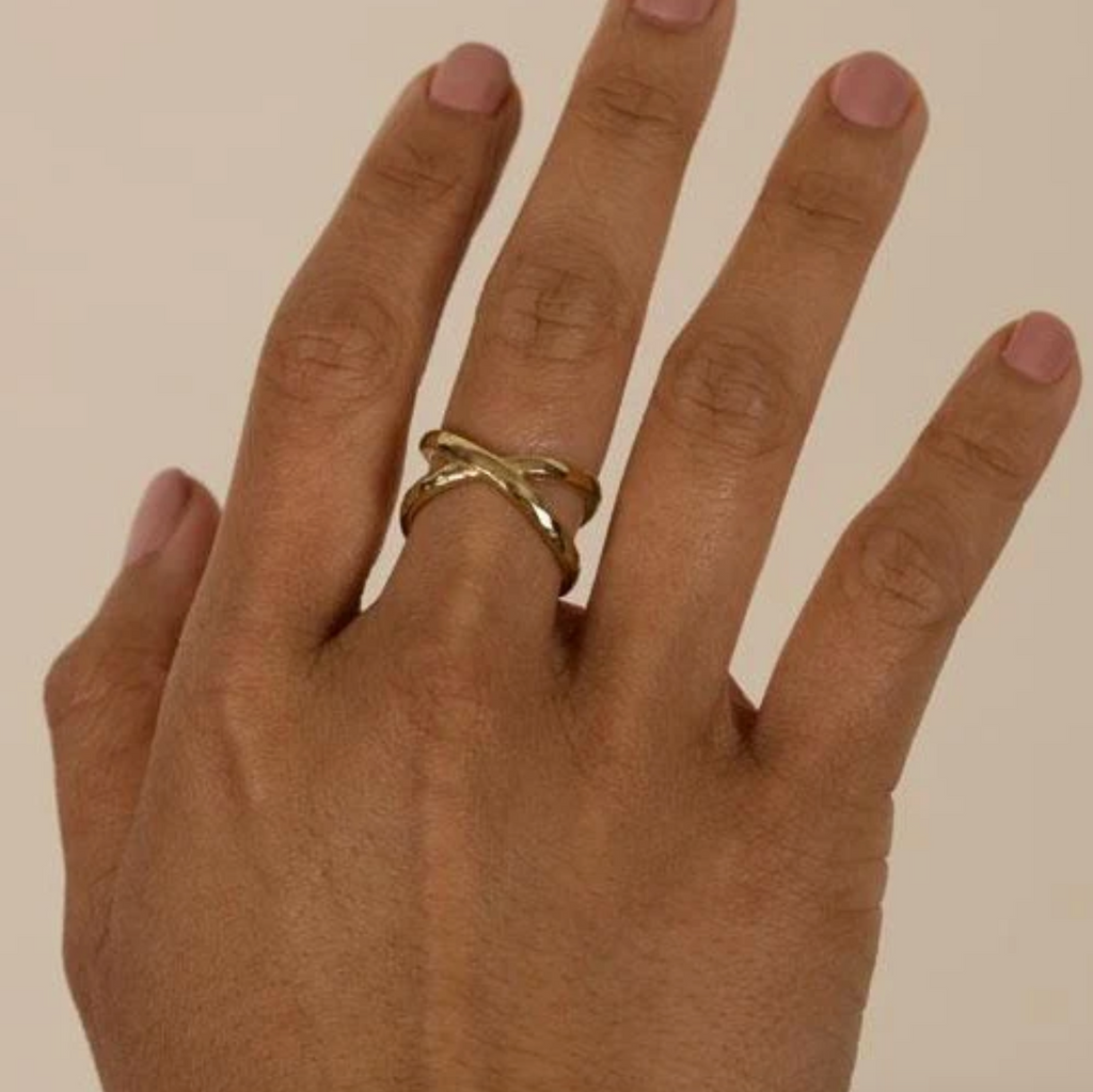Handcrafted and modern this ring is cast in jeweler’s brass in a size 7, this ring with adjust up or down a size. Brass will oxidize over time, but you can polish it up with a polishing cloth.