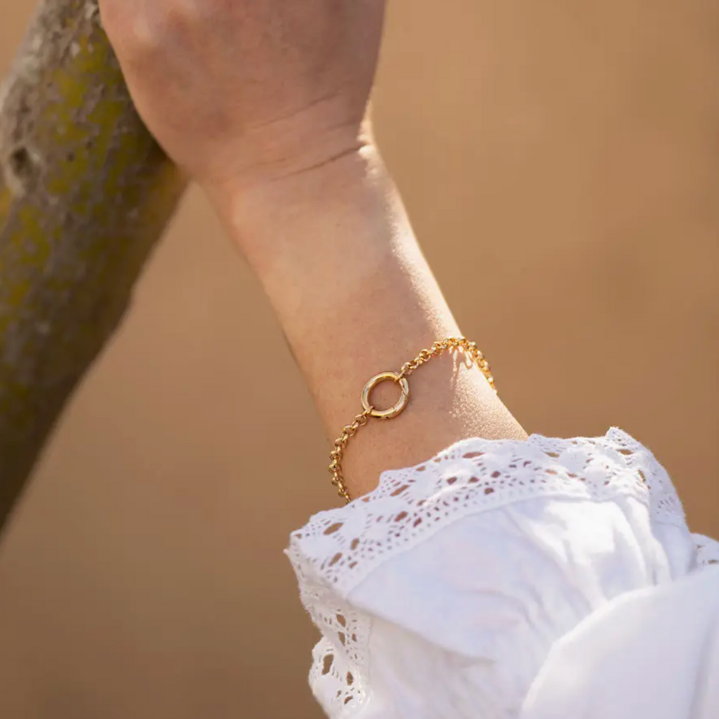 This chain and charm holder clasp has been a big hit in the necklace so we've made a bracelet too. It is made of 14k gold plated brass and coated to resist tarnish. Assembled in our Sonoma California studio.