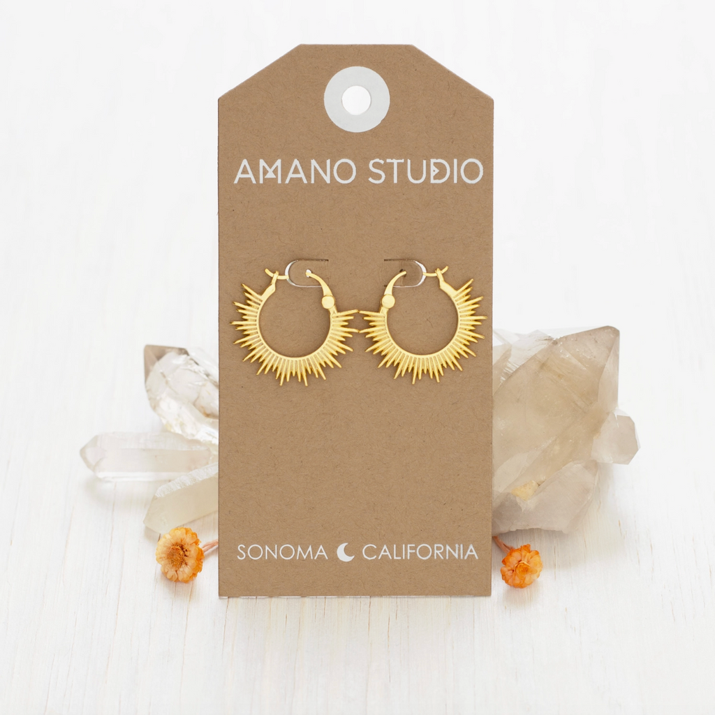 Here in the Golden State we look to the sky for inspiration. The sunburst hoop earrings celebrate the golden rays of el sol. Made of 14k gold plated brass, lead and nickel free. Designed in our Sonoma California studio.