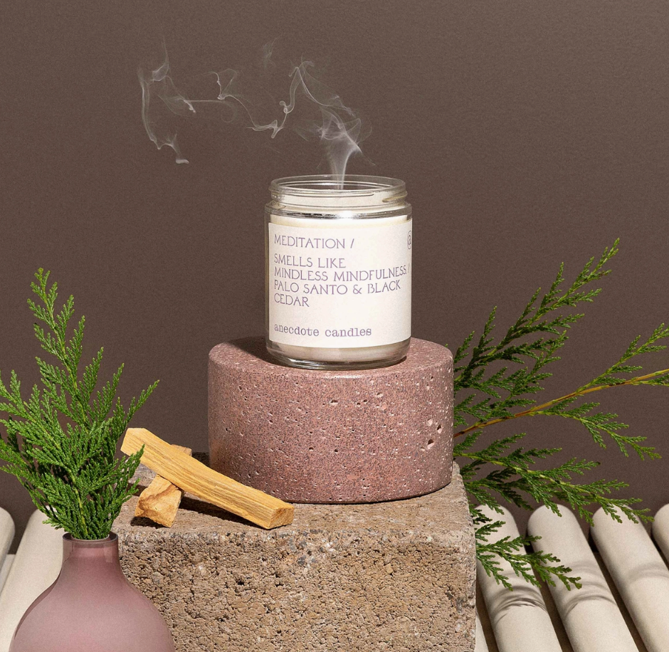 Palo Santo & Black Cedar - Light this candle and watch your worries melt away. Misted heliotrope, grey quartz, and amber bring clarity and fresh perspectives. Smoky base notes of palo santo and black cedar add depth and texture to the fragrance for a modern take on mindfulness. Additional information: Made with coconut-soy wax, cotton core wicks, and phthalate-free fragrance oils. Jars are 7.8 oz and have a burn time of approximately 40 - 50 hours.