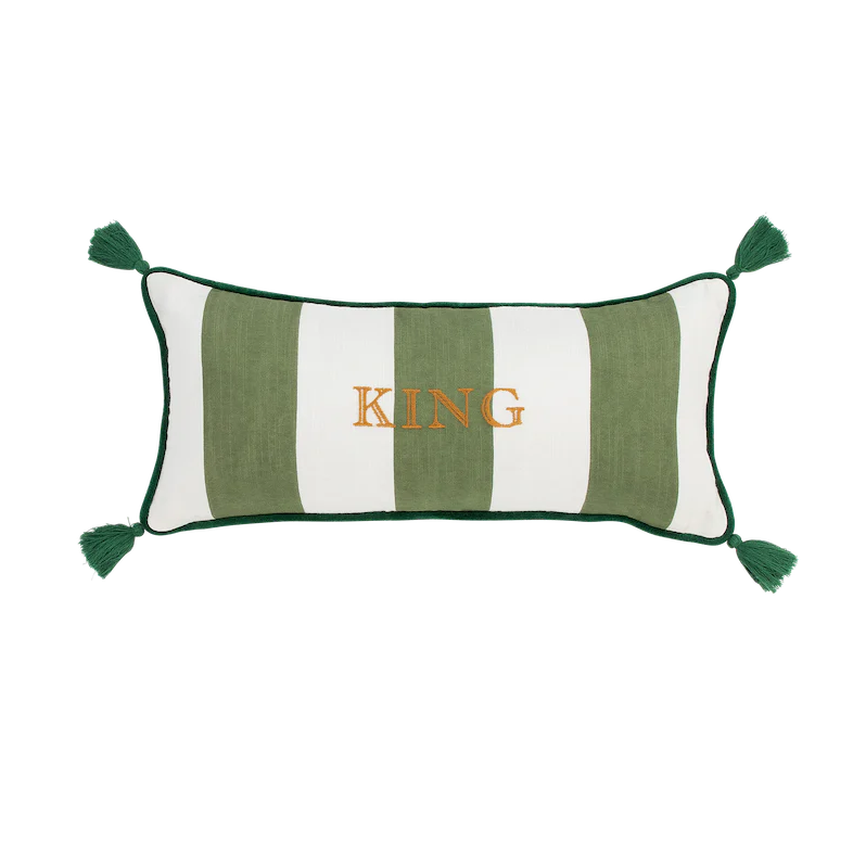 The King Cushion brings regal charm to any space with its distinctive green and white stripes, embroidered 'KING' centrepiece, and playful corner tassels. This statement cushion adds instant character to your sofa, armchair, or bed, transforming everyday spaces into styled sanctuaries. Pair it with the Queen Cushion for a charming his-and-hers combination.