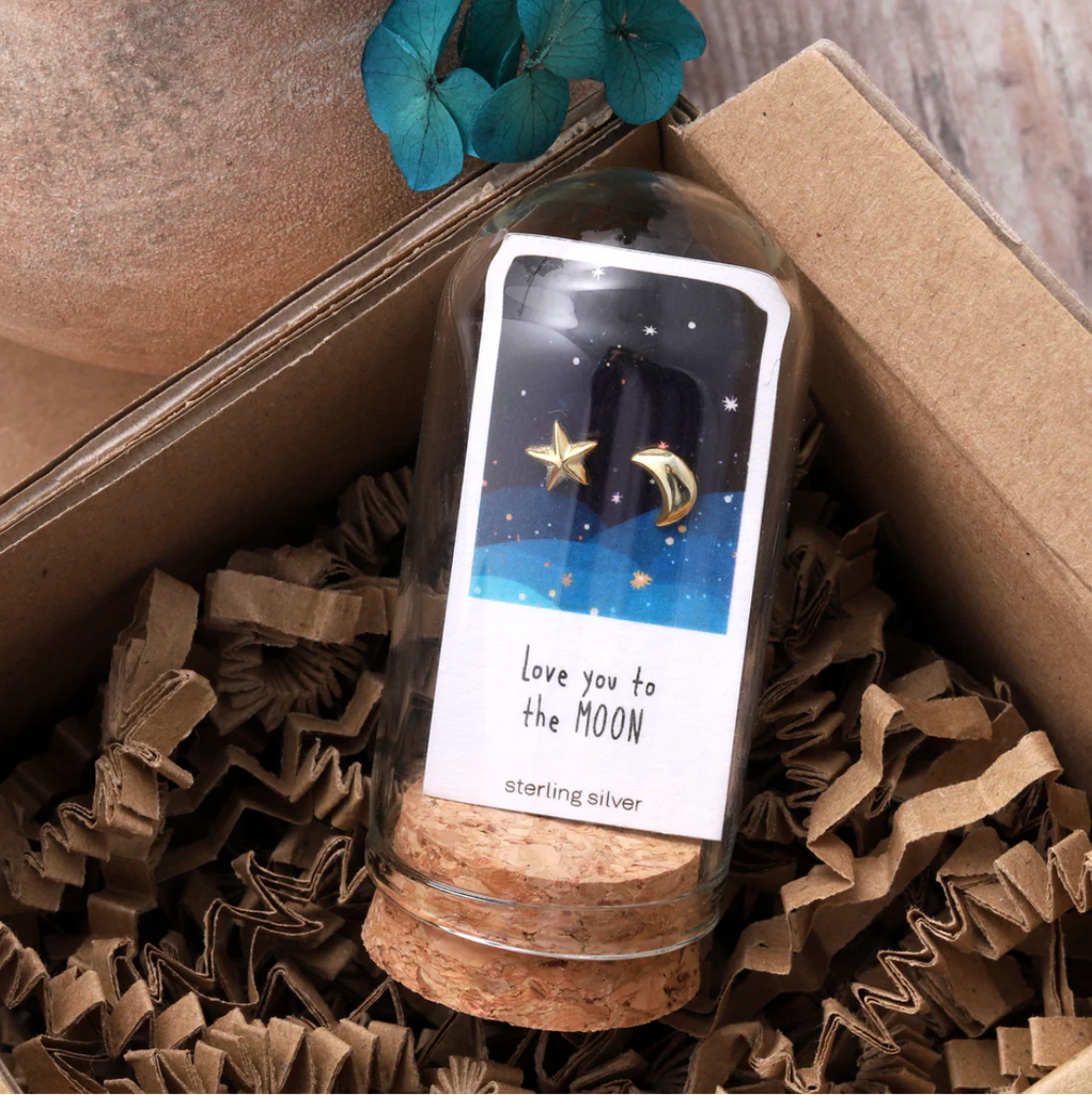 Love You To The Moon - Silver Stud Earrings with Gold finish