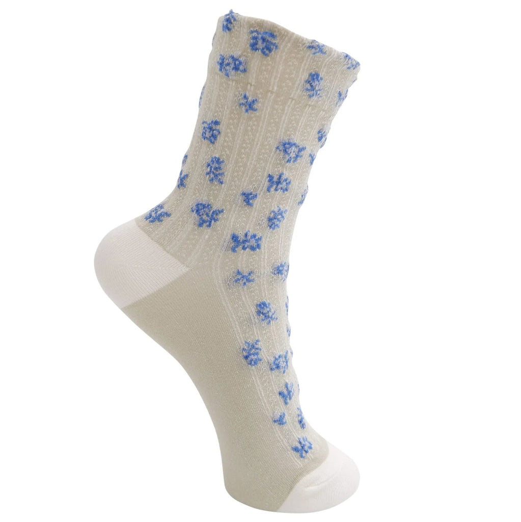Elevate your everyday essentials with the Celandine socks in Khaki/Blue. These charming socks blend delicate floral motifs with subtle stripes, creating a feminine yet graphic look that adds personality to any outfit.