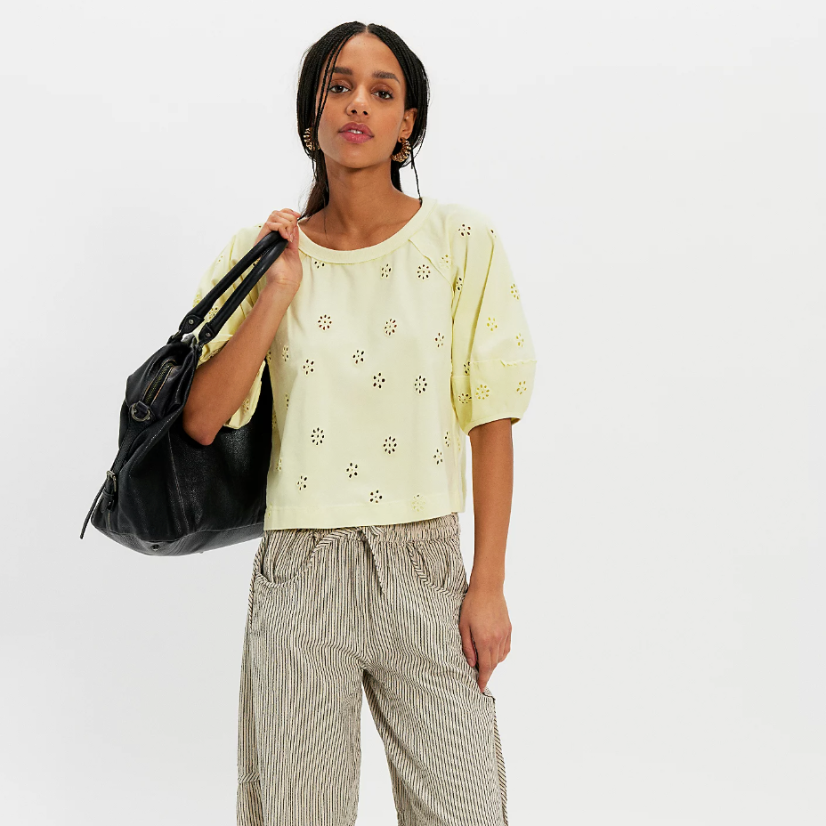 This breezy cotton-blend Free People Jessie Eyelet Tee combines a cropped, relaxed fit with statement raglan sleeves that add just the right amount of personality. Intricate eyelet detailing brings visual interest, while the soft, lightweight fabric keeps things comfortable all day long. Pair it with everything from denim to skirts for instant ease.