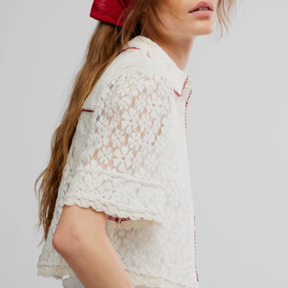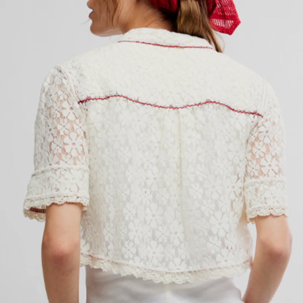 This cropped lace button-up is pure romance with a modern twist. Crafted from delicate floral lace with charming scalloped edges, it boasts a crisp collar, short sleeves, and a front button closure. The whisper-white base gets a cheeky lift from contrast red picot trim that adds just enough personality without stealing the show. Layer it over a bralette or slip dress for instant vintage-meets-now vibes, or wear solo on balmy days when you're feeling that effortless, feminine energy. Your go-to piece for weekend adventures and those moments when you want to look like you didn't try—but absolutely did.