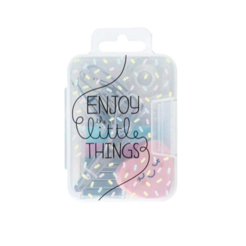 MINI STATIONERY SET • The set includes 6 mini accessories: scissors, eraser, pagemarkers, adhesive tape with dispenser, stapler and staples PACKAGING PP box L 7 x H 10.5 x W 3 cm