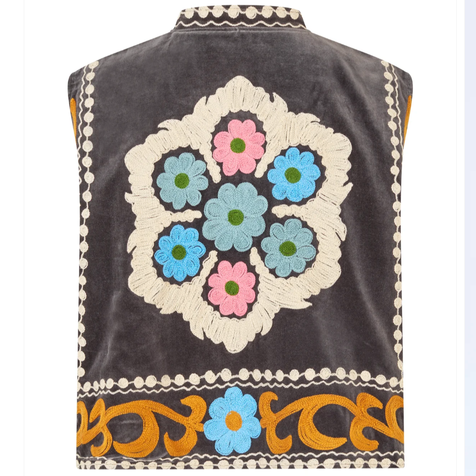 Embrace a bohemian-inspired style with the BinLL vest by Lollys Laundry, a true statement piece that adds color and character to any outfit. Made from luxurious, soft velour, this vest is adorned with beautiful floral embroidery in vibrant shades of pink, blue, and green on a classic grey or deep pink background. The bold pattern gives the vest a vintage look with a modern twist, perfect for styling over a simple T-shirt or your favorite dress. The BinLL vest is not just a piece of clothing; it's a wearable piece of art.
