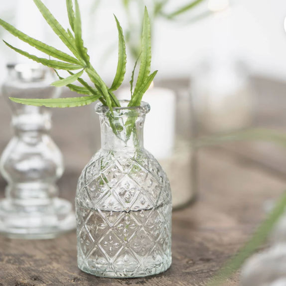 This simple glass bottle candle holder pressed with a delicate 'Harlequin' pattern.