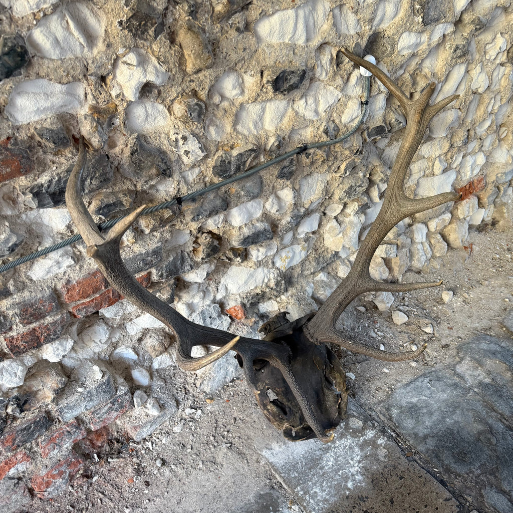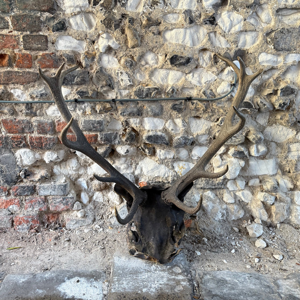 Add dramatic natural character to your interior with this impressive set of large vintage antlers. Perfect for creating a rustic, country, or lodge-style aesthetic, these authentic antlers make a striking statement piece.